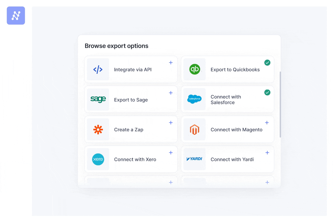 Integrate your existing business tools seamlessly with Nanonets to automate data collection, exports storage, bookkeeping, and much more.