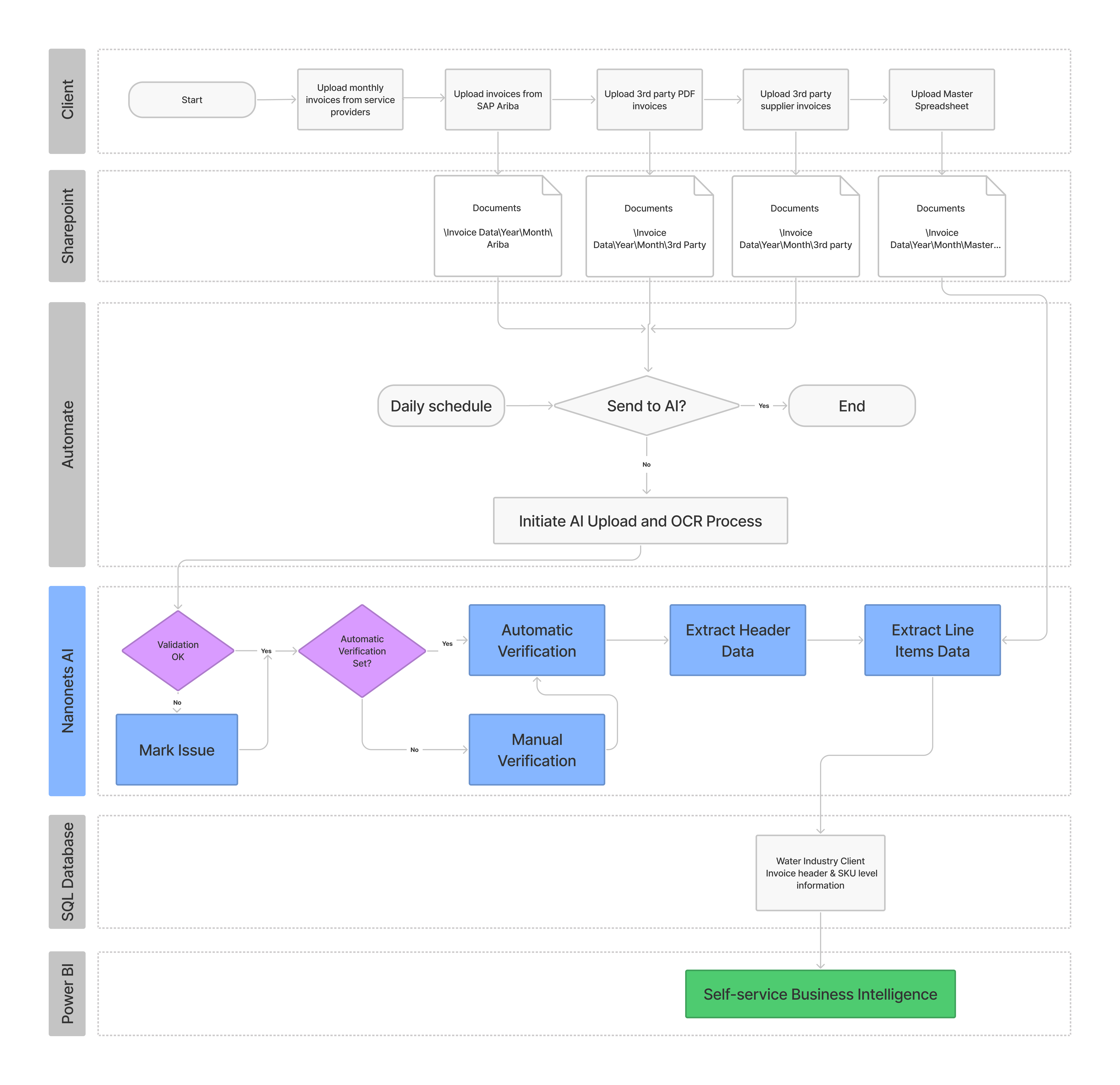 Nanonets setup a data validation workflow that receives invoices from SAP Ariba System, 3rd Party supplier invoices and Sharepoint: Nanonets Pre-trained Invoice Extractor captured information in real-time and routed this information to In2 Project Management’s SQL Database. The extracted information was validated against client's spend management system. The updated database was plugged into Power BI, which brought insightful visualisations alive.