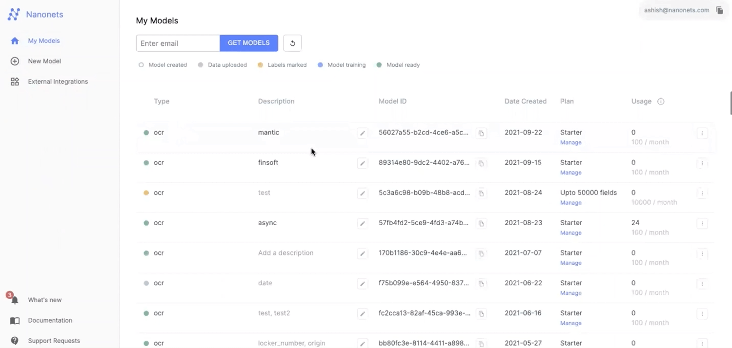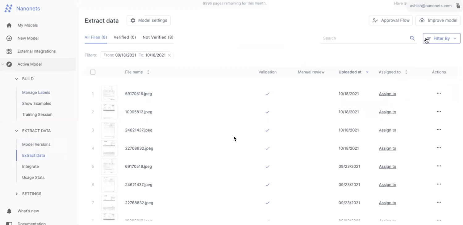 Nanonets platform automatically parses through all the files using its advanced OCR and returns the files that contain the values you are looking for.