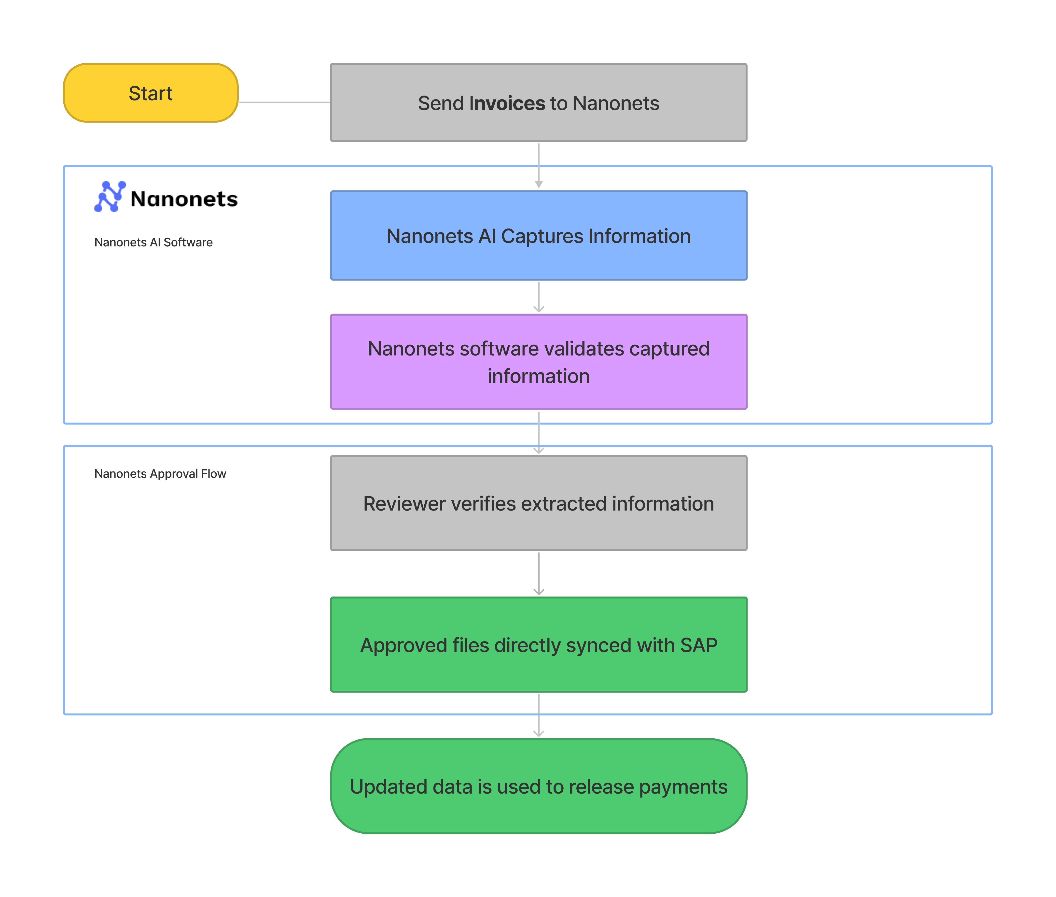 Once Saltpay sends an invoice to Nanonets, Nanonets automatically validated certain number of conditions based on the business logic provided by Saltpay. Thereafter, a SaltPay team member manually approves the data extraction in Nanonets, which uploads the data directly into SAP. The reviewer then manually approves the fields in SAP. This two-pronged approach gives SaltPay confidence that their system correctly stores the information.
